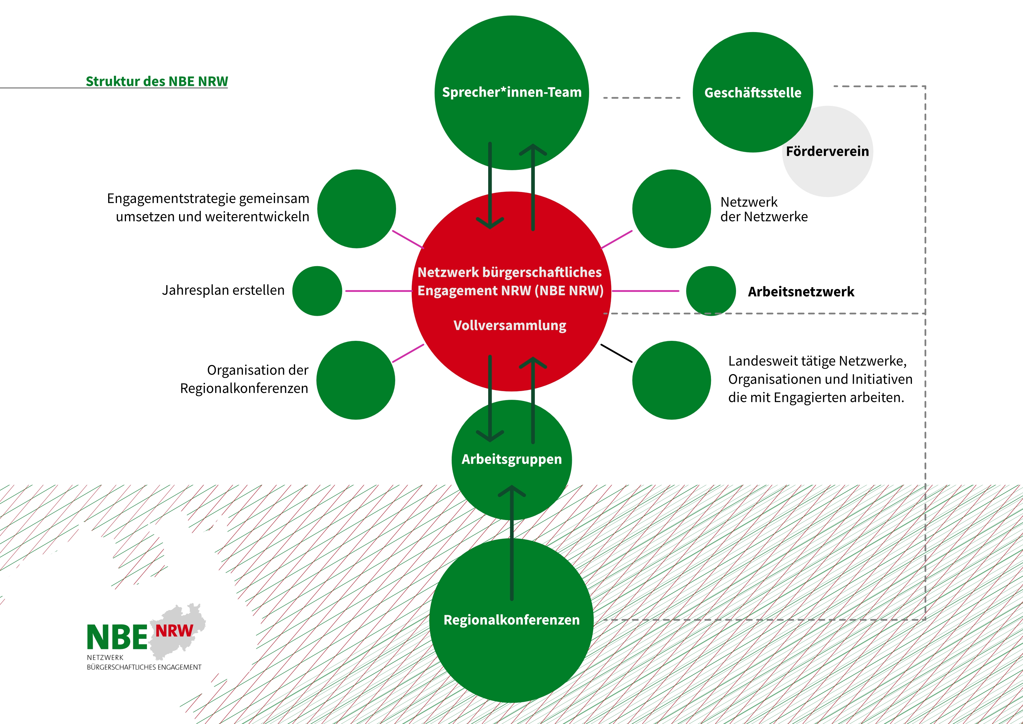 Das NBE NRW versteht sich als Netzwerk der Netzwerke und als Sprachrohr für die Engagierten im Land. Ziel des Netzwerkes ist es, die Engagementstrategie für das Land NRW gemeinsam umzusetzen und weiterzuentwickeln. Als aktives Arbeitsnetzwerk verbindet das NBE NRW die lokale, die regionale und die Landesebene sowie unterschiedliche Sektoren durch Austausch- und Arbeitsformate wie Regionaltreffen in den einzelnen Landesteilen und Arbeitsgruppen zu den Handlungsfeldern der Engagementstrategie.