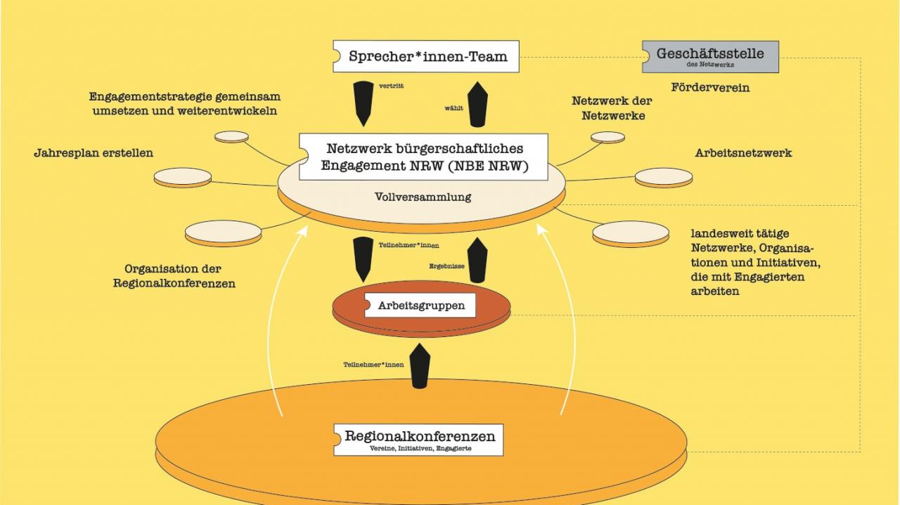 Das NBE NRW versteht sich als Netzwerk der Netzwerke und als Sprachrohr für die Engagierten im Land. Ziel des Netzwerkes ist es, die Engagementstrategie für das Land NRW gemeinsam umzusetzen und weiterzuentwickeln. Als aktives Arbeitsnetzwerk verbindet das NBE NRW die lokale, die regionale und die Landesebene sowie unterschiedliche Sektoren durch Austausch- und Arbeitsformate wie Regionaltreffen in den einzelnen Landesteilen und Arbeitsgruppen zu den Handlungsfeldern der Engagementstrategie.