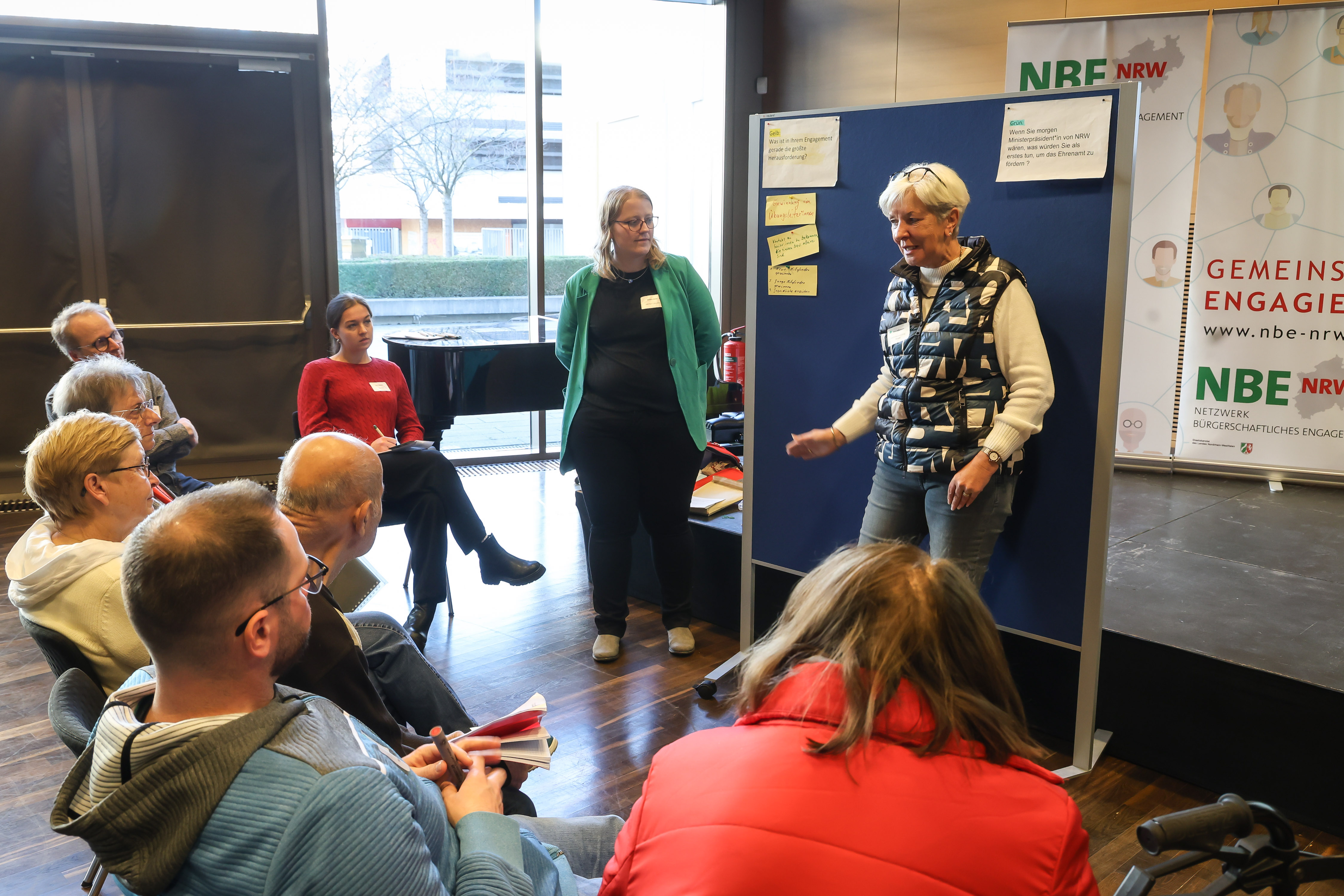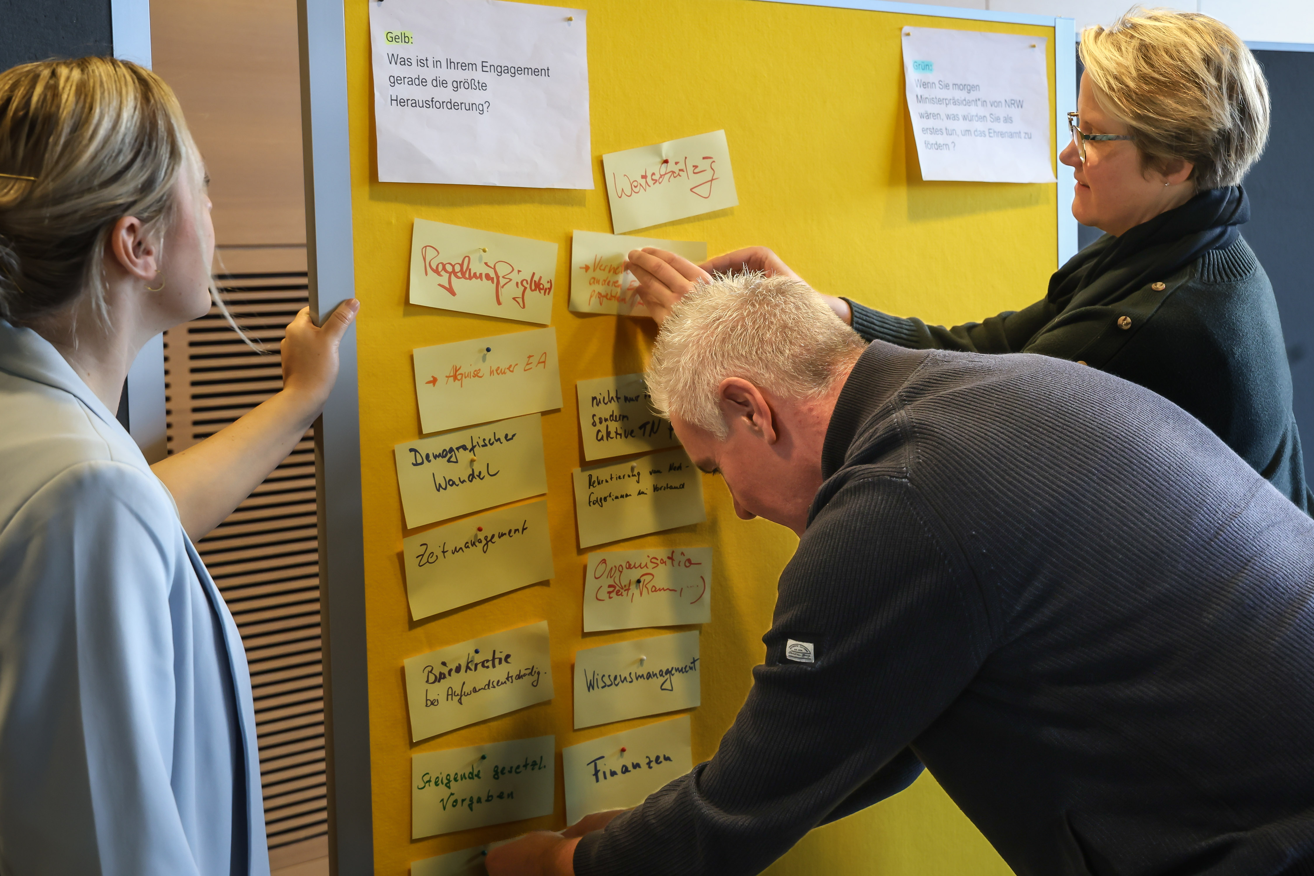 In Austauschrunden nannten die Teilnehmenden aus den Engagementfeldern Sport, Wohlfahrtspflege, Kirche sowie Kultur dringendste Herausforderungen wie: die Akquise neuer Ehrenamtlicher und die Aktivierung von Mitgliedern, verlässliche Budgets, flexible Fortbildungen, mehr Vernetzung mit anderen Ehrenamtsprojekten und die Schwierigkeit, schnell an notwendige Informationen zu kommen. Anwesende aus Inklusionsinitiativen wiesen auf die Barrieren in den Köpfen und die Überwindung von Hemmschwellen hin.